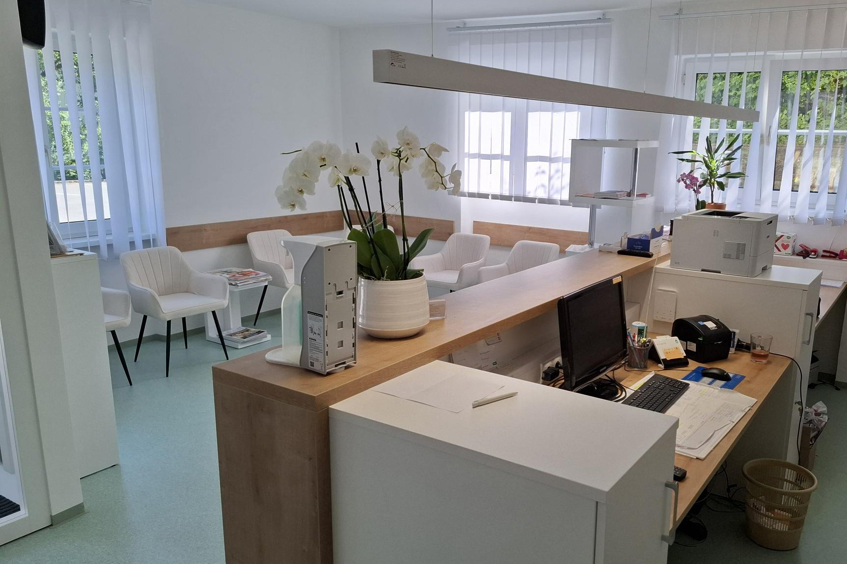 Pfarrheim nach der Sanierung: Aus einem ehemaligen Gemeinschaftsraum (Bild Mitte) wurde ein moderner und offener Warte- und Anmeldebereich der Arztpraxis; Fotos©Gemeinde St. Florian am Inn